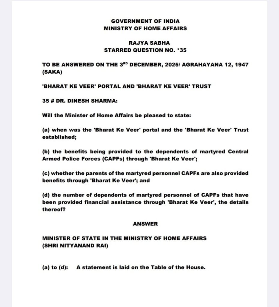 सरकार की ओर से पेश किए गए लिखित बयान के अनुसार, ‘भारत के वीर’ पोर्टल को वर्ष 2017 में लॉन्च किया गया था, जबकि ‘भारत के वीर’ ट्रस्ट की स्थापना 2018 में की गई। इसका उद्देश्य केंद्रीय सशस्त्र पुलिस बलों (CAPFs) के शहीदों के परिवारों को वित्तीय सहायता उपलब्ध कराना है।