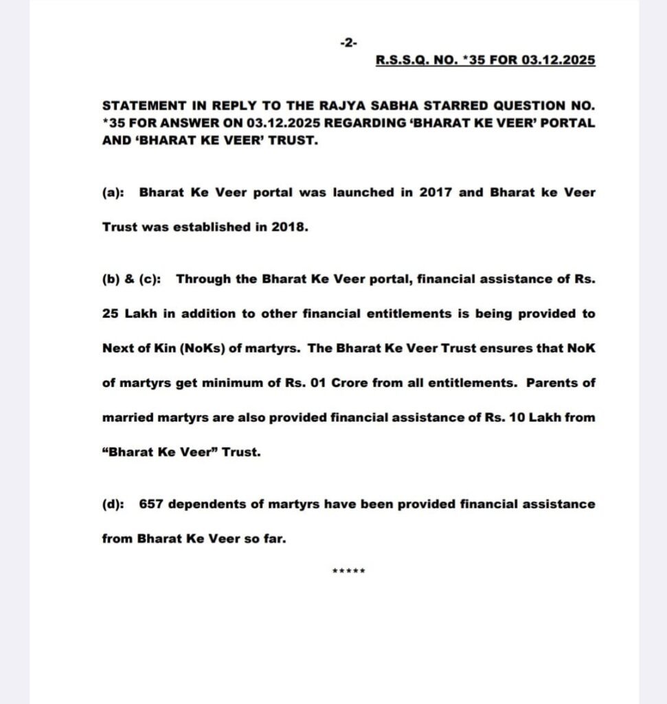 सरकार ने बताया कि ‘भारत के वीर’ पोर्टल के माध्यम से शहीदों के आश्रितों को 25 लाख रुपये की वित्तीय सहायता प्रदान की जाती है। इसके अलावा अन्य सरकारी अधिकारिक लाभ भी अलग से दिए जाते हैं। ट्रस्ट यह सुनिश्चित करता है कि शहीद के आश्रितों को कुल मिलाकर कम से कम 1 करोड़ रुपये की सहायता विभिन्न स्रोतों से मिल सके।