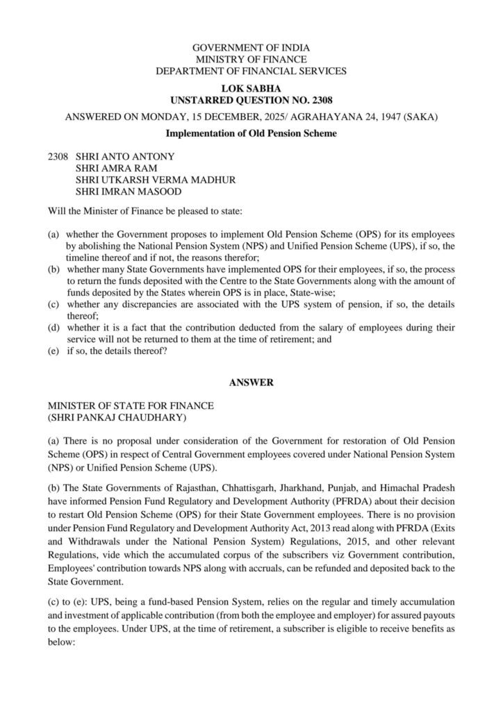 यह जानकारी अतारांकित प्रश्न संख्या 2308 के जवाब में राज्य वित्त मंत्री, श्री पंकज चौधरी द्वारा दी गई। सरकार ने स्पष्ट किया कि केंद्रीय कर्मचारी नेशनल पेंशन सिस्टम (NPS) या यूनिफाइड पेंशन स्कीम (UPS) के दायरे में ही रहेंगे।