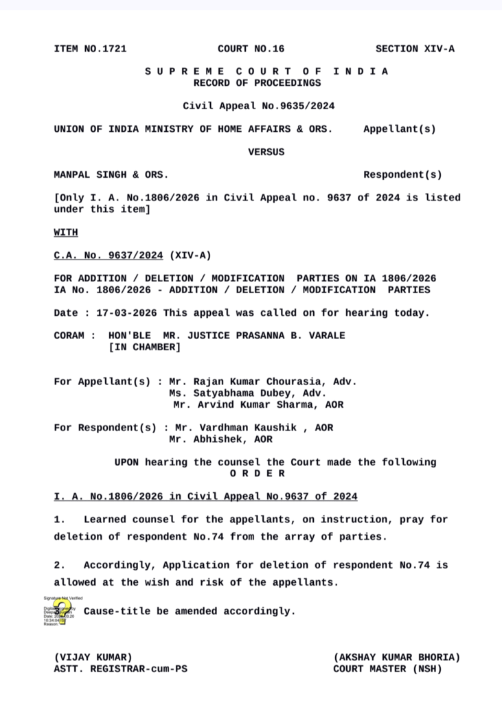 नई दिल्ली: Supreme Court of India में केंद्रीय सशस्त्र पुलिस बल (CAPF) के जवानों की पुरानी पेंशन (OPS) से जुड़े महत्वपूर्ण मामले में 17 मार्च 2026 को सुनवाई हुई। इस केस (Civil Appeal No. 9635/2024 – Union of India vs Manpal Singh & Ors.) पर देशभर के लाखों जवानों की नजर बनी हुई है।