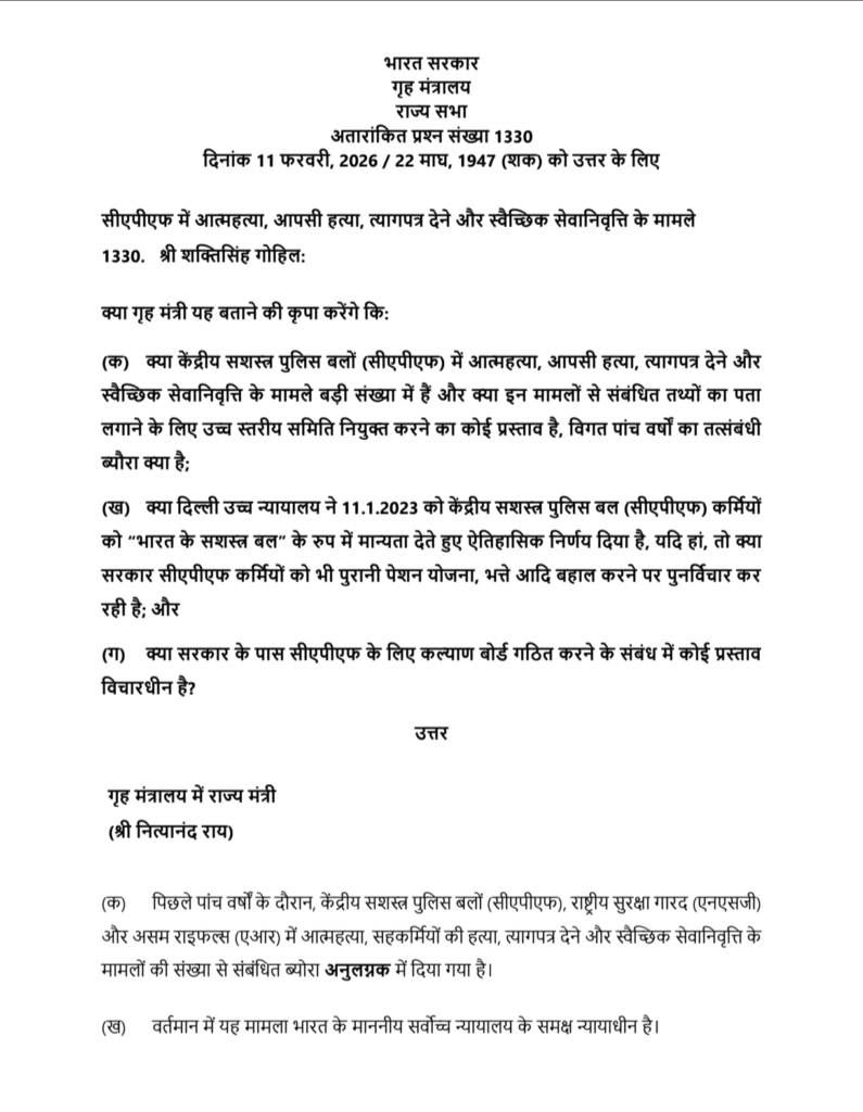 राज्यसभा में उठा CAPF जवानों के आत्महत्या ,त्यागपत्र और पुरानी पेंशन(OPS) का मुद्दा, सरकार ने प्रस्तुत किए आंकड़े