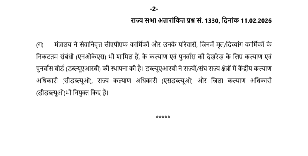 बलों के कल्याण पर पूछे गए सवाल के जवाब में गृह मंत्रालय ने बताया कि सेवानिवृत्त कर्मियों, दिव्यांग जवानों और शहीद परिवारों (NOKs) की देखभाल के लिए कल्याण एवं पुनर्वास बोर्ड (WARB) की स्थापना की जा चुकी है