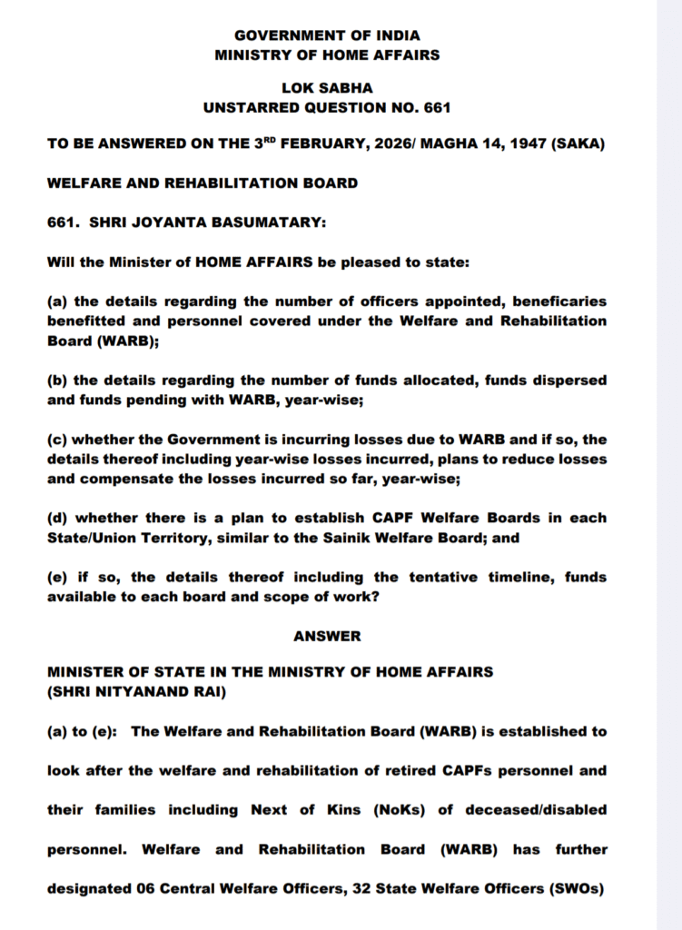 रिटायर्ड CAPF जवानों के कल्याण के लिए WARB सक्रिय; सैनिक कल्याण बोर्ड की तर्ज पर प्रत्येक राज्य में अलग ‘CAPF कल्याण बोर्ड’ बनाने की कोई योजना नहीं: गृह मंत्रालय