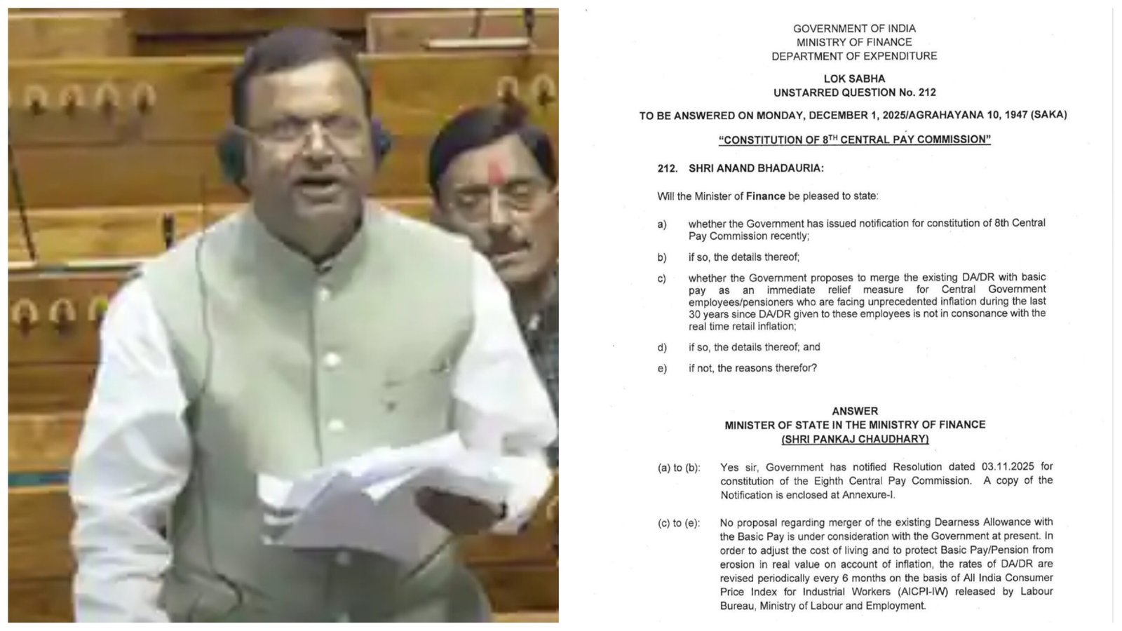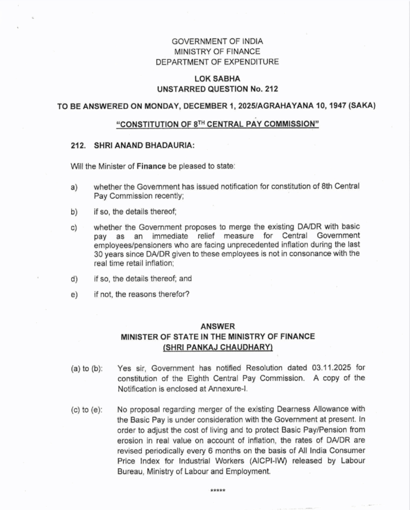 8th Pay Commission: सरकार ने किया स्पष्ट , बेसिक पे में DA मर्ज करने की फिलहाल कोई योजना नहीं