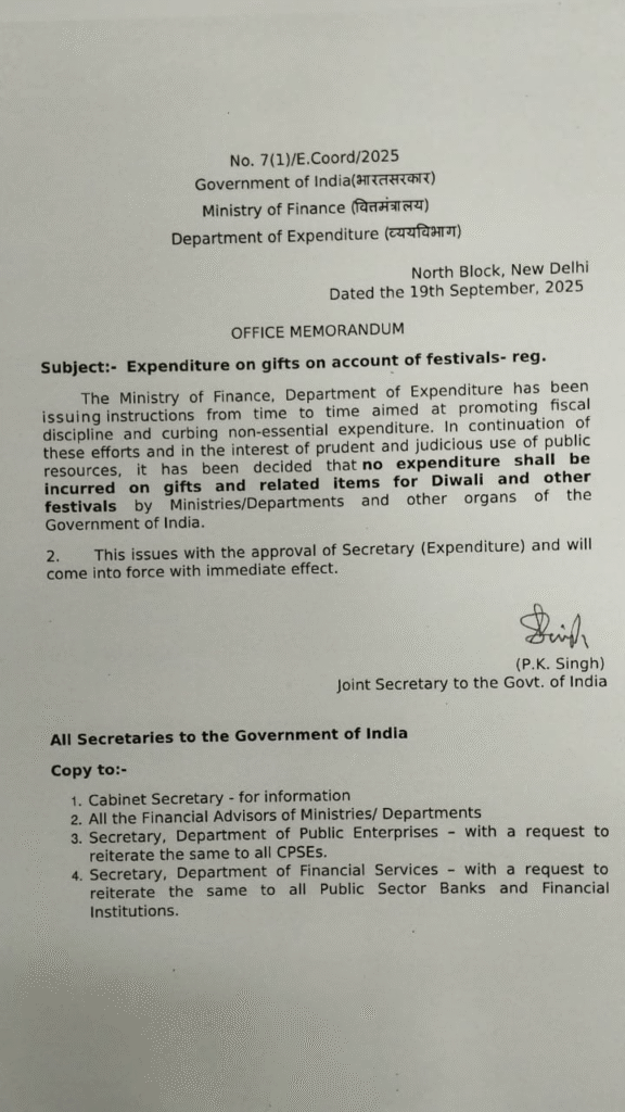 आदेश के अनुसार, वित्त मंत्रालय ने स्पष्ट किया है कि सभी केंद्रीय मंत्रालय और विभाग अब त्योहारों पर गिफ्ट देने की प्रथा को हतोत्साहित करेंगे। यह निर्देश वित्त मंत्रालय के व्यय विभाग के सचिव की सहमति से जारी किया गया है।