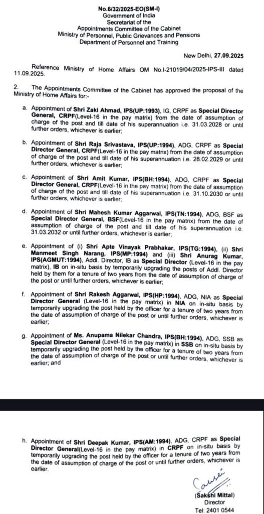राकेश अग्रवाल (IPS, HP:1994) को NIA में, जबकि अनुपमा निलेखर चंदन (IPS, BH:1994) को SSB में विशेष महानिदेशक का दायित्व सौंपा गया है।