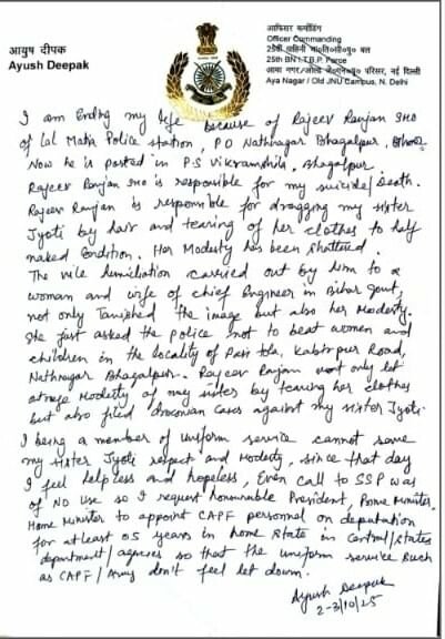 अब ताज़ा जानकारी के मुताबिक, आईटीबीपी के सख्त रुख और केंद्रीय बल अफसरों के दबाव के बाद पटियाला पुलिस ने बिहार के SHO राजीव रंजन (थाना लालमटिया, पीओ नाथनगर, भागलपुर, बिहार) के खिलाफ भारतीय न्याय संहिता (BNS) की धारा 108 के तहत केस दर्ज किया है — यह धारा आत्महत्या के लिए उकसाने से जुड़ी है, जिसमें 10 साल तक की सजा और जुर्माने का प्रावधान है।