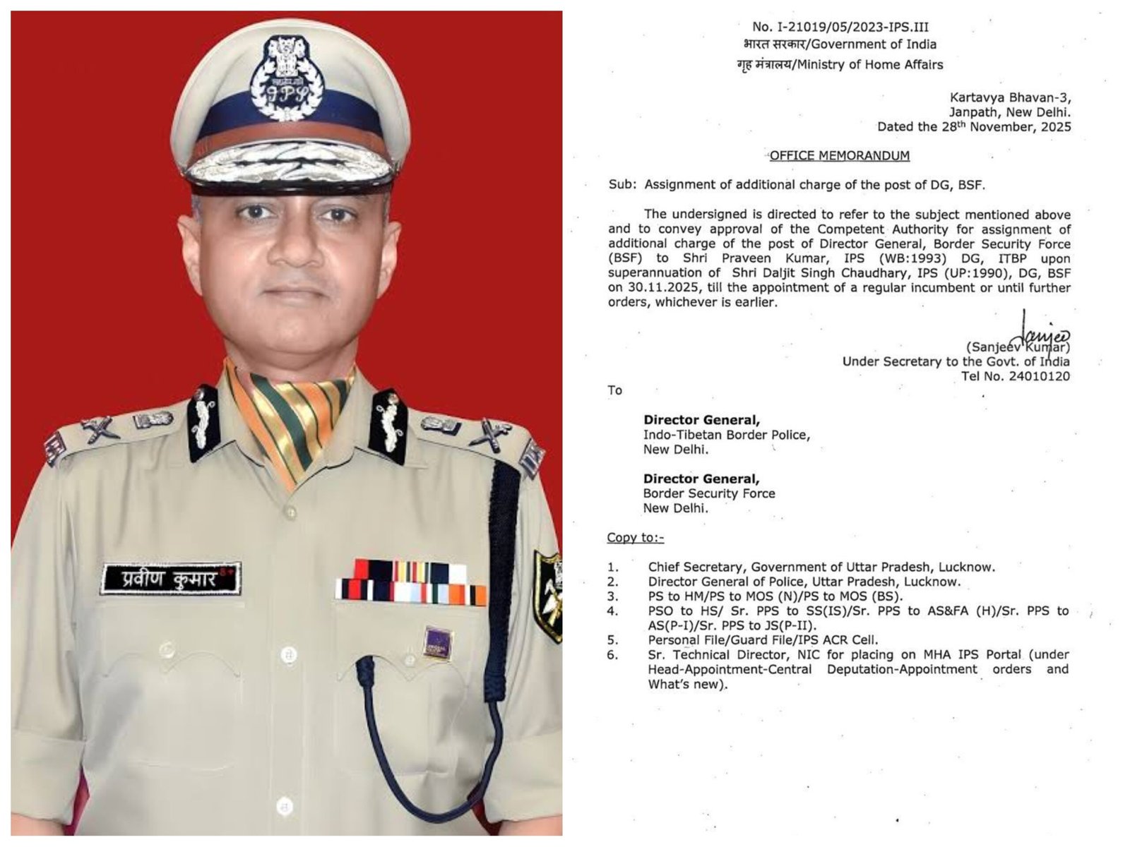 ज्ञापन के अनुसार, BSF के वर्तमान महानिदेशक दलजीत सिंह चौधरी 30 नवंबर 2025 को सेवानिवृत्त हो रहे हैं। उनकी सेवानिवृत्ति के बाद, प्रवीण कुमार BSF DG का दायित्व नियमित नियुक्ति होने तक या अगले आदेश जारी होने तक, जो भी पहले हो, निभाएंगे।