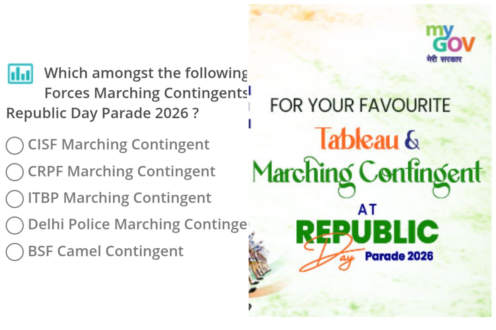 गणतंत्र दिवस 2026: बेस्ट मार्चिंग कंटिंजेंट के लिए वोटिंग शुरू। CRPF, CISF, ITBP, BSF और दिल्ली पुलिस में से चुनें अपना पसंदीदा मार्च-पास्ट।