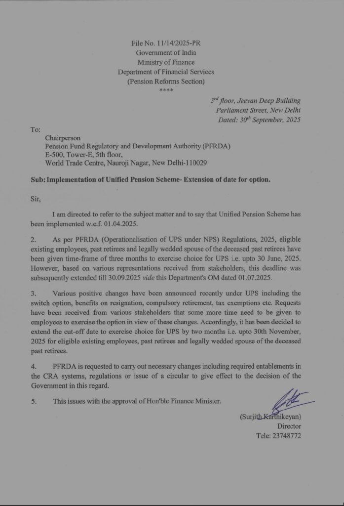 केंद्र सरकार ने एक बार फिर यूनिफाइड पेंशन स्कीम (UPS) में शामिल होने की अंतिम तिथि बढ़ा दी है। वित्त मंत्रालय के वित्तीय सेवा विभाग (पेंशन सुधार अनुभाग) ने 30 सितंबर को जारी पत्र में पेंशन फंड रेगुलेटरी एंड डेवलपमेंट अथॉरिटी (PFRDA) को निर्देश दिया है कि UPS ग्रहण करने की समयसीमा को 30 नवंबर 2025 तक के लिए बढ़ा दिया जाए।